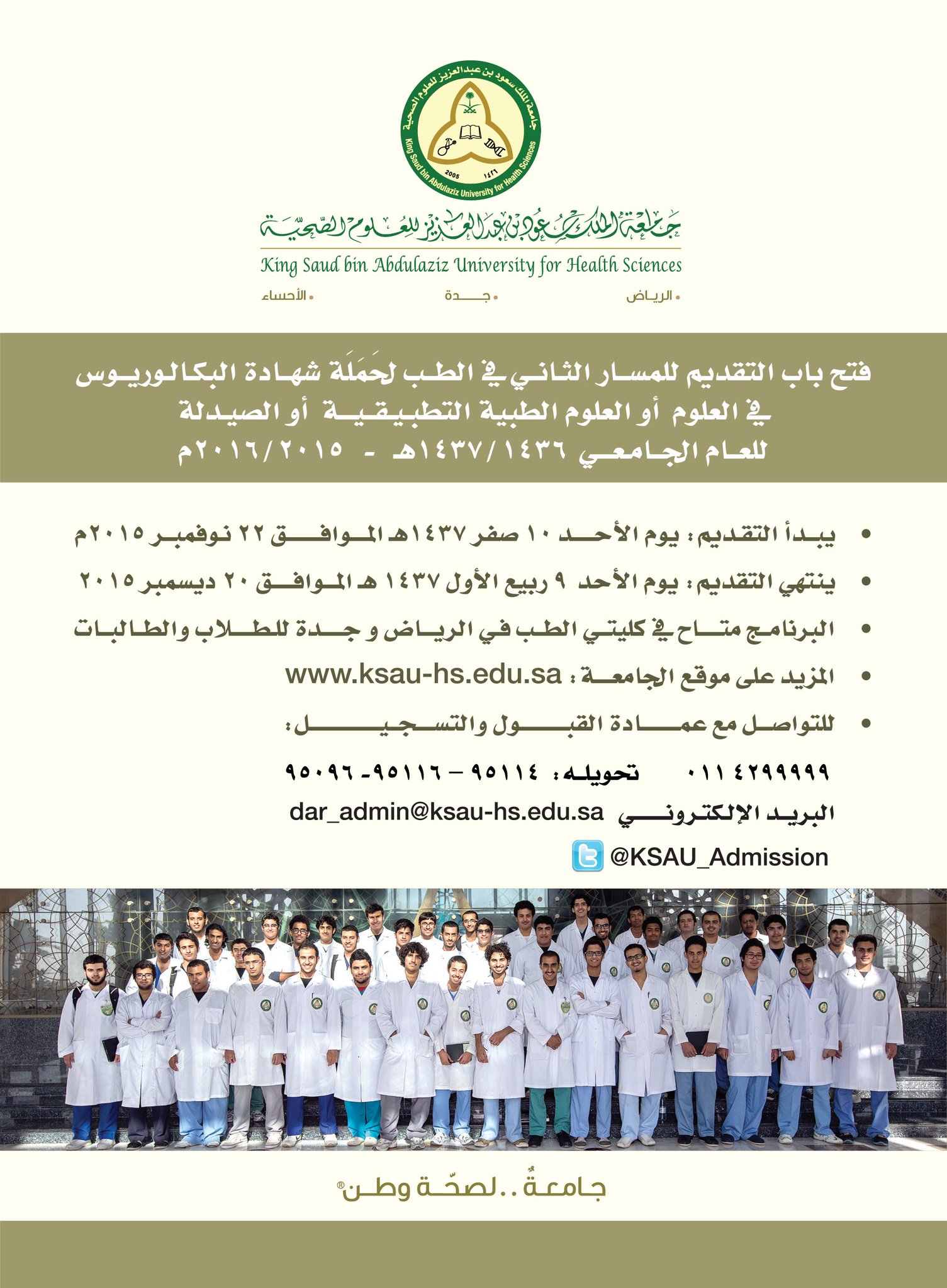 جامعة الملك سعود بن عبدالعزيز للعلوم الصحية On Twitter بدء التقديم على برنامج دراسة الطب المسار الثاني لحملة البكالوريوس ويستمر حتى ٧ ديسمبر ٢٠١٦ م Https T Co Qqewbhw5j4 Ksau Hs Https T Co Mld6nggnqf