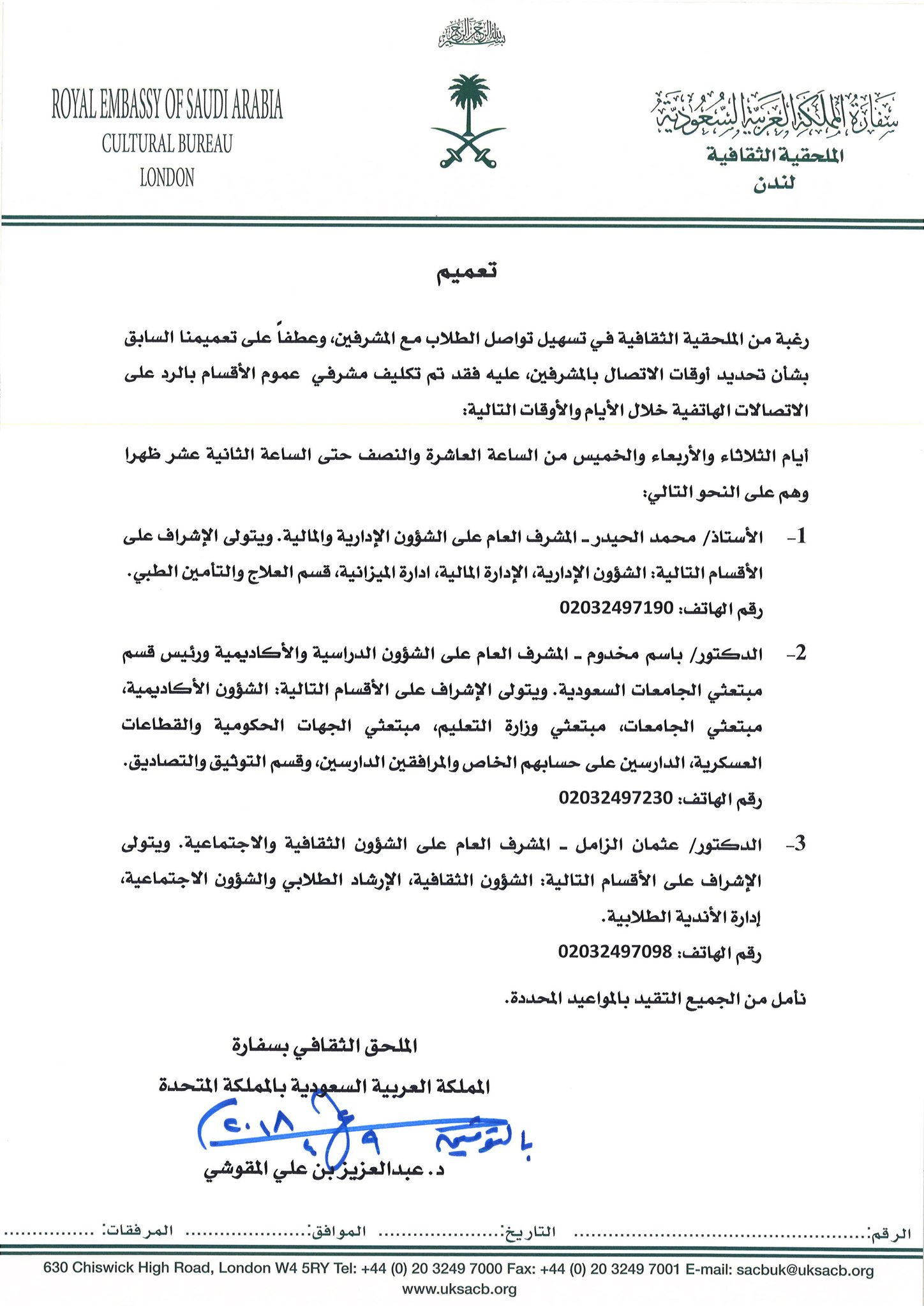 الملحقية الثقافية السعودية بالمملكة المتحدة لندن On Twitter الملحق الثقافي يكلف المشرفين العموم في الملحقية بالرد على الإتصالات الهاتفية للطلبة المبتعثين أيام الثلاثاء والأربعاء والخميس مابين 10 30 صباحا وحتى 02 00 ظهرا