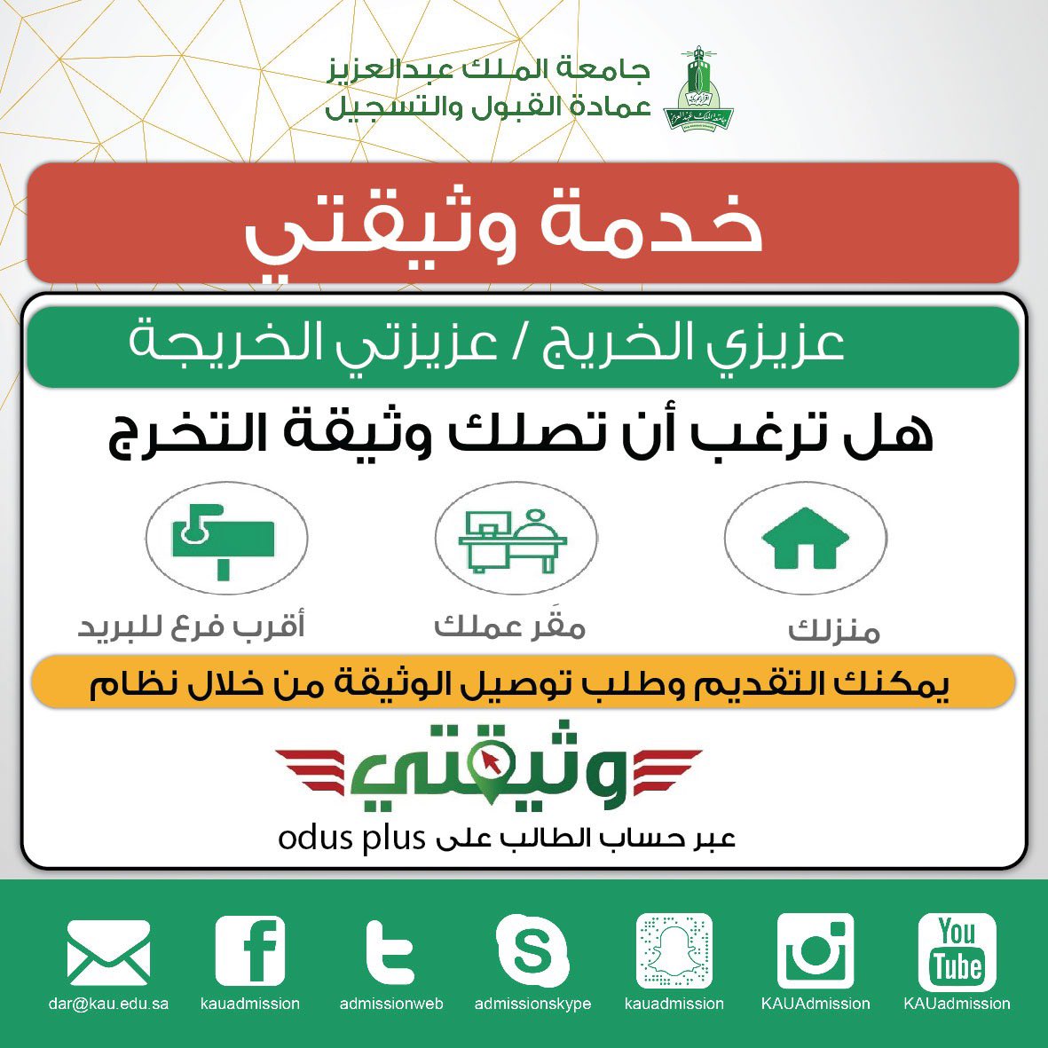 Uzivatel عمادة القبول والتسجيل Kau Na Twitteru عـزيزي خريج عزيزتي خريجة جامعة الملك عبدالعزيز متاح الآن التسجيل عبر أيقونة وثيقتي من خلال Odus Plus لإستلام وثيقة التخرج كشف الدرجات تمنياتنا