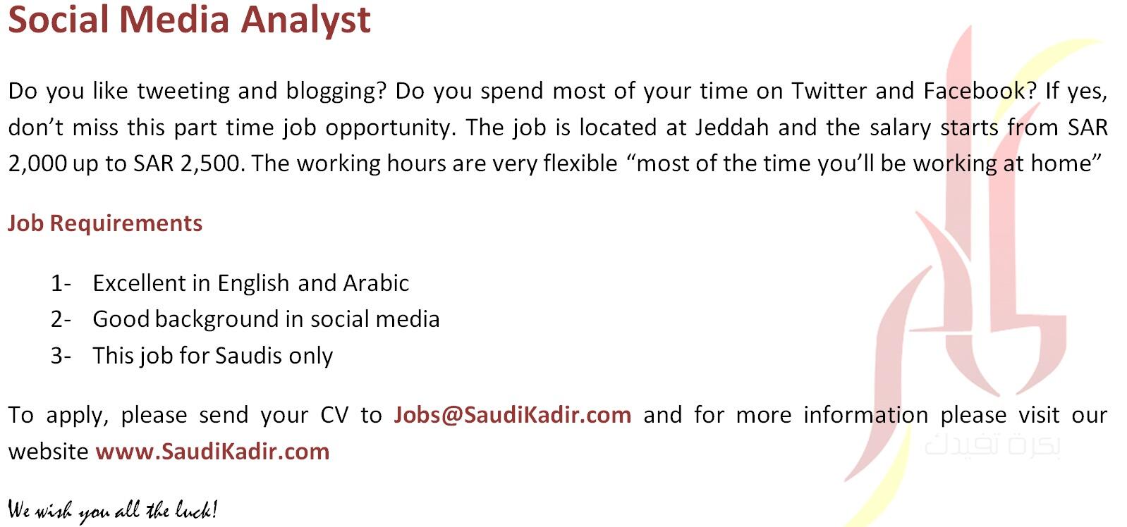 كادر On Twitter Social Media Analyst Part Time Job At Jeddah To Apply Please Send Your Cv To Jobs Saudikadir Com Http T Co Lp2kz8t8yl